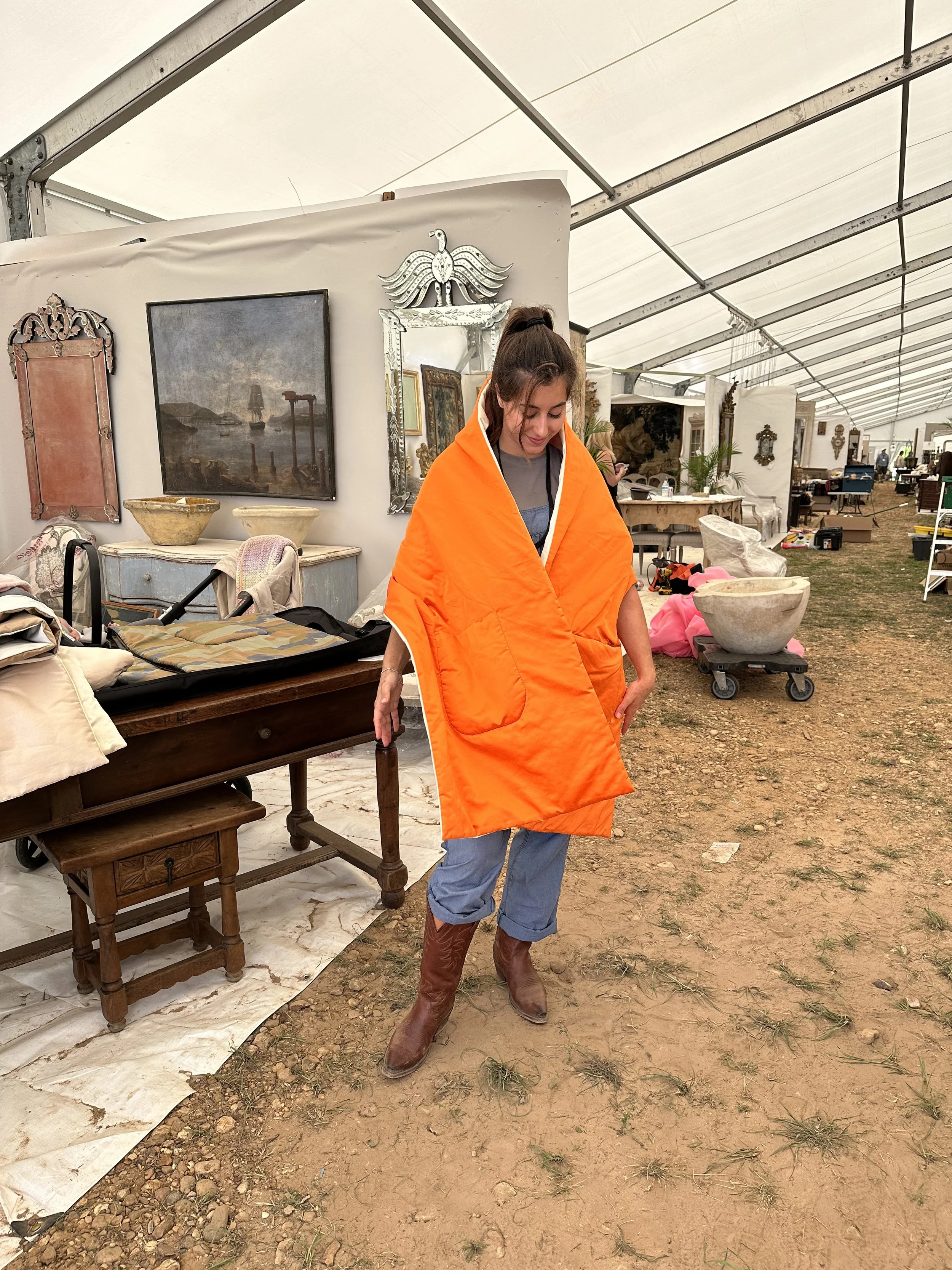 Reversible Royal Duchess orange silk / cream silk wrap with four pockets. Lined with Italian down lining.